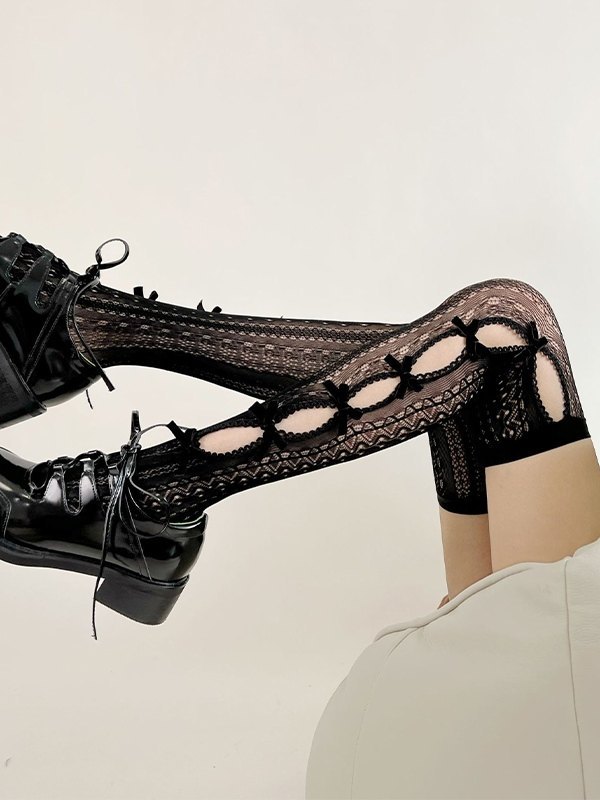 Bow Embellish Cutout Lace Thigh High Socks