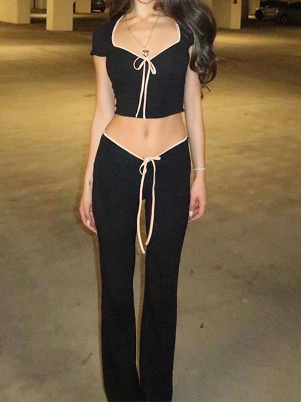 Contrast Color Trim Square Neck Tee&Low Rise Flare Pants Set