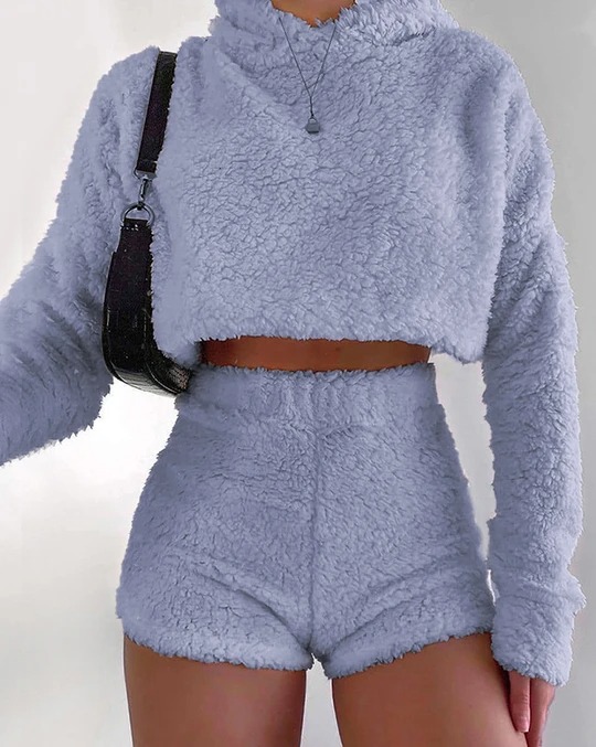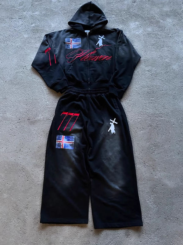 Vintage Print Short Sweatshirt&Drawstring Cargo Skirt Set