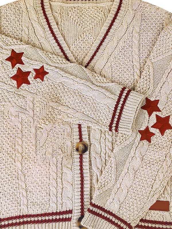 Star Embroidered Print Cable Knit V Neck Cardigan