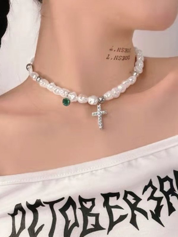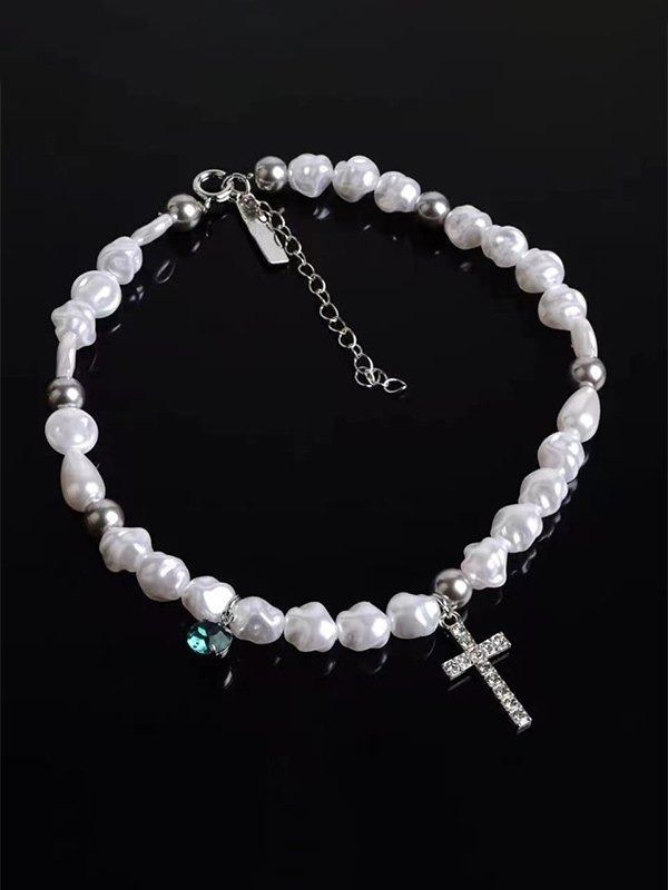 Rhinestone Cross Pendant Faux Pearl Choker Necklace