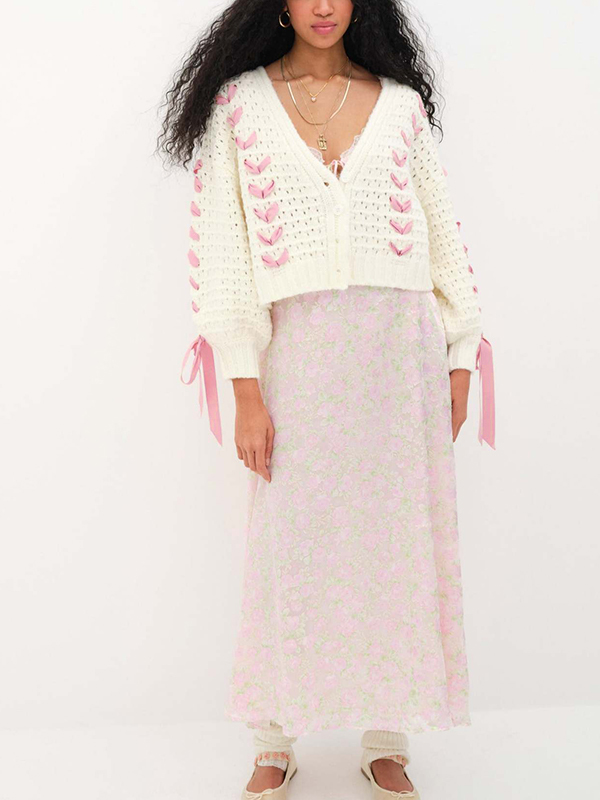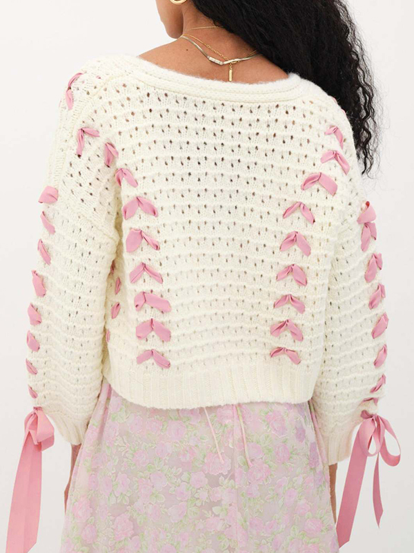 Cutout V Neck Lace Up Loose Short Knit Cardigan