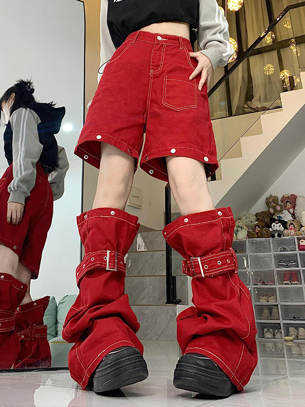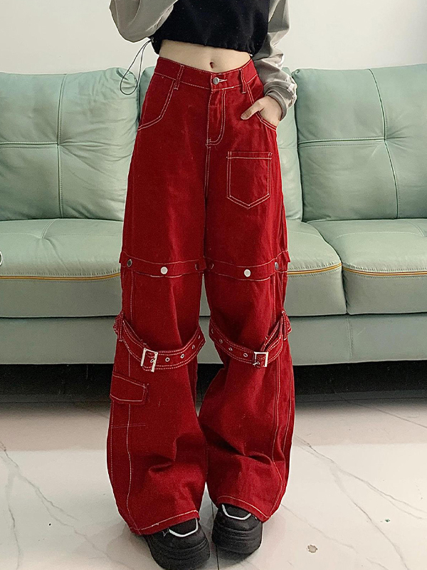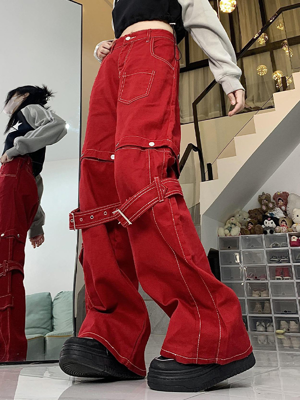 Top-stitching Buckle Design Removable Wide Leg Pants