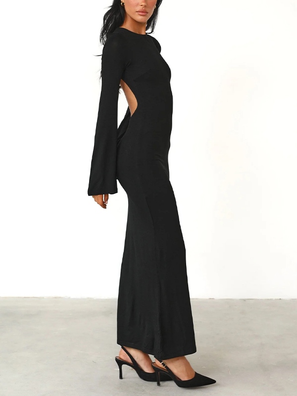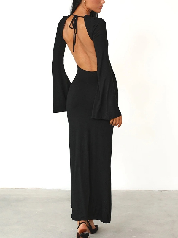 Solid Backless Trumpet Sleeve Maxi Dress