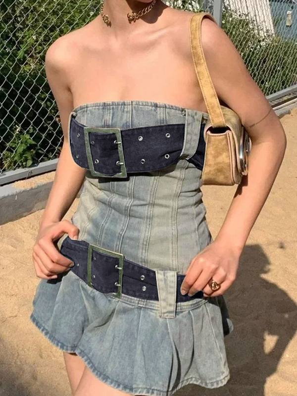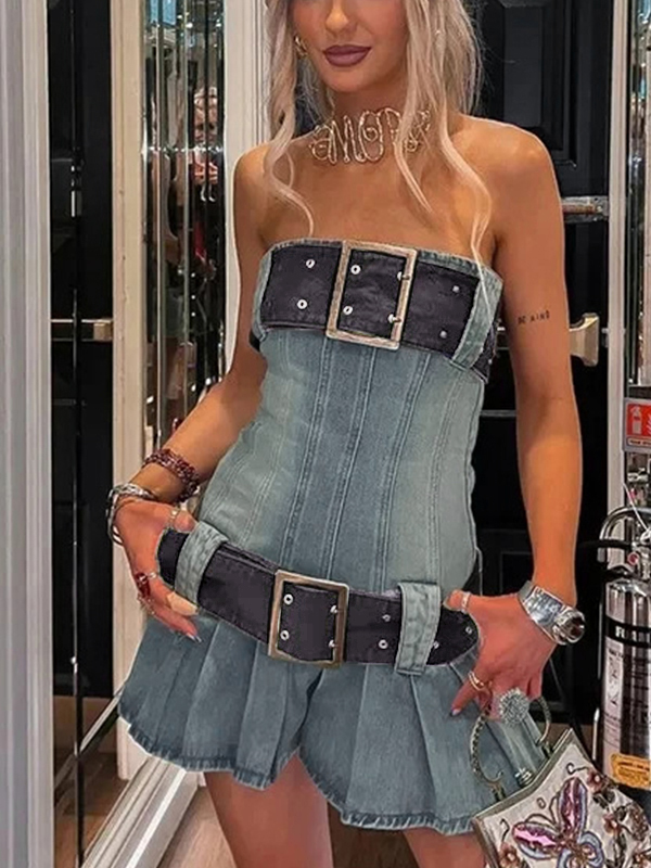 Vintage Denim Belted Bandeau Pleated Mini Dress