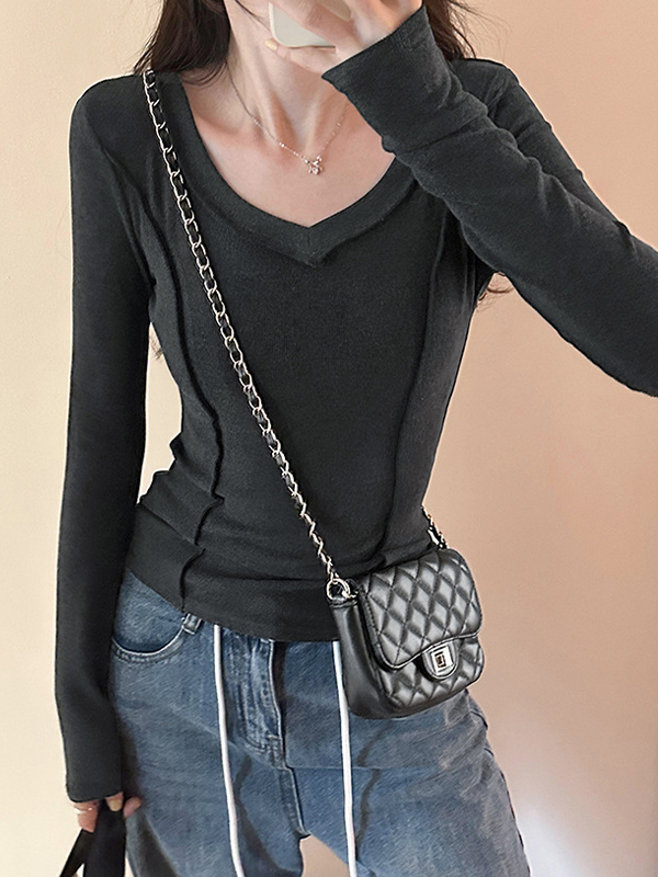 Solid V Neck Seam Detail Slim Long Sleeve Knit