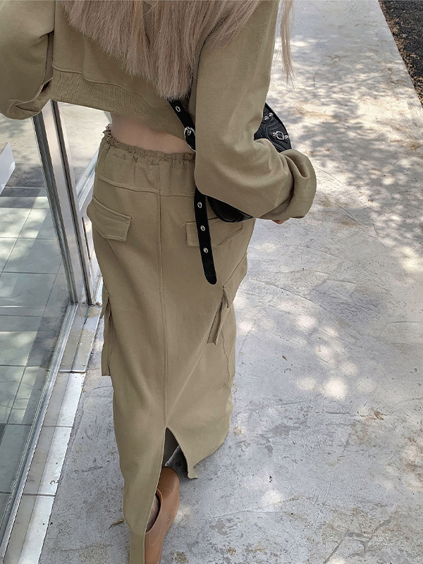 Vintage Print Short Sweatshirt&Drawstring Cargo Skirt Set