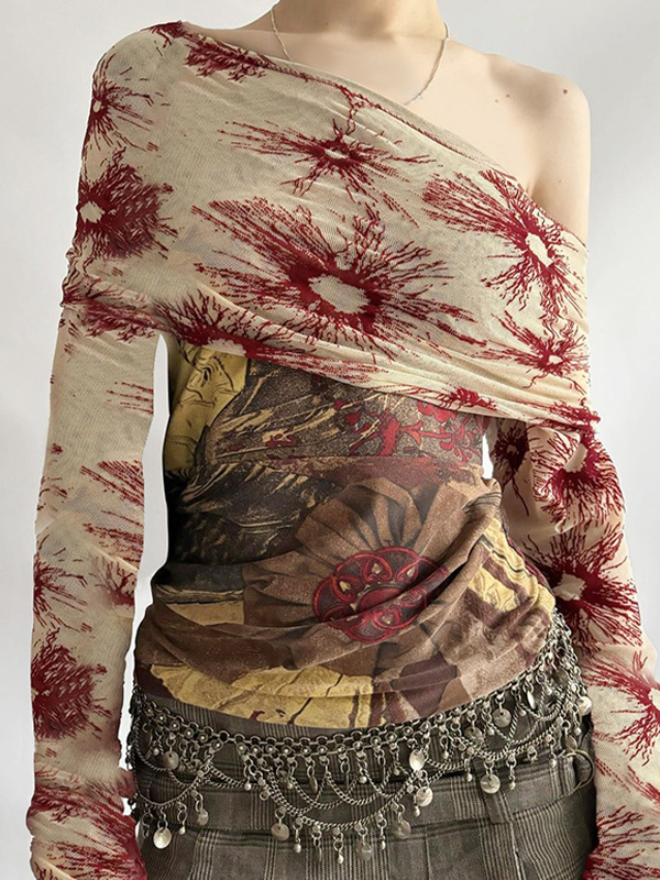 One Shoulder Mesh Splicing Long Sleeve Tee