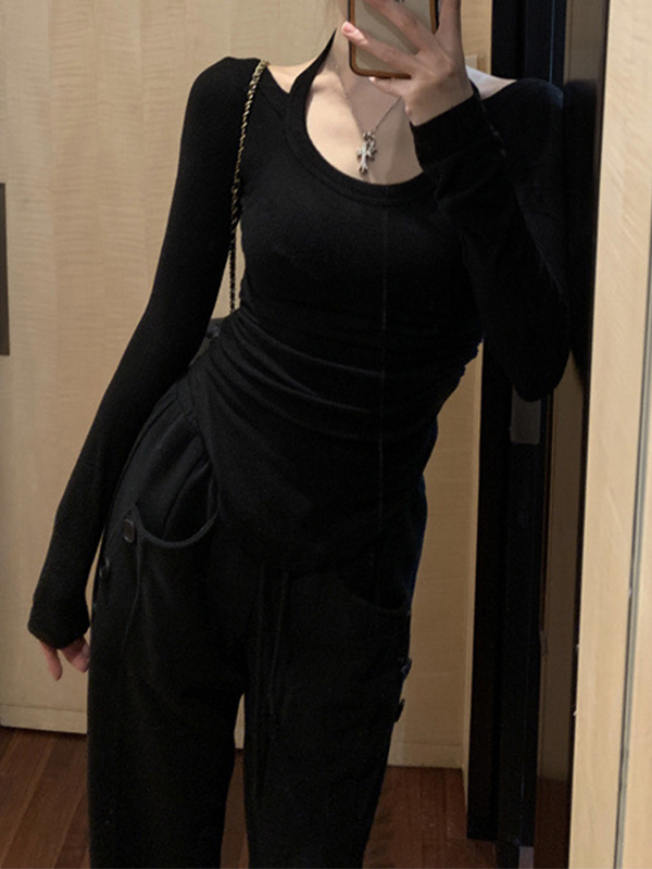 Solid Halter Backless Curvy Hem Long Sleeve Knit